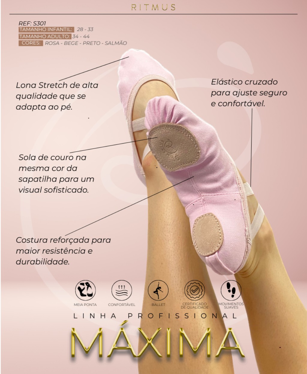 Feita para quem já tem experiência e quer uma sapatilha que acompanhe cada movimento com leveza e segurança, a Máxima é o modelo ideal para quem busca alto desempenho e conforto profissional.